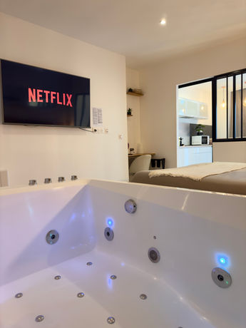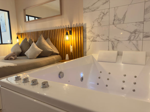 Le deuxième espace est dédié à la détente : une chambre avec un lit queen-size, orné d’une tête de lit en bois et d’appliques murales, fait face à un grand écran connecté avec de nombreuses applications. Au centre, une baignoire balnéo deux places avec jets hydromassants, bain bouillonnant et chromothérapie, dominée par un miroir géant qui amplifie l’espace et le charme de la pièce.